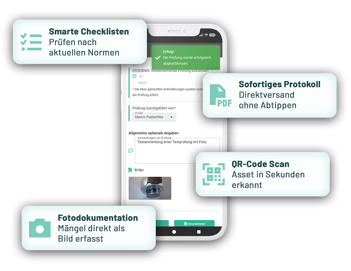 Für den harten Einsatz vor Ort entwickelt. Unsere mobile App für iOS und Android macht das Smartphone zum effizienten Prüfwerkzeug. Intuitive Bedienung, schnelle Foto-Erfassung – optimiert für Techniker, die keine Zeit zu verlieren haben.