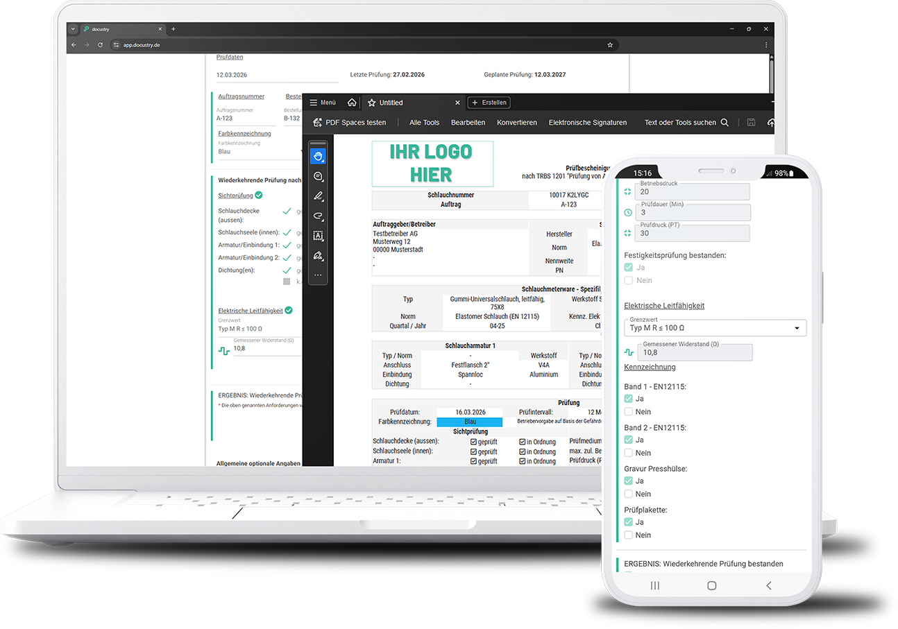 Mit docustry lassen sich Prüfungen / Wartungen, deren Dokumentation und die Erstellung der Zertifikate vollständig digital erledigen.